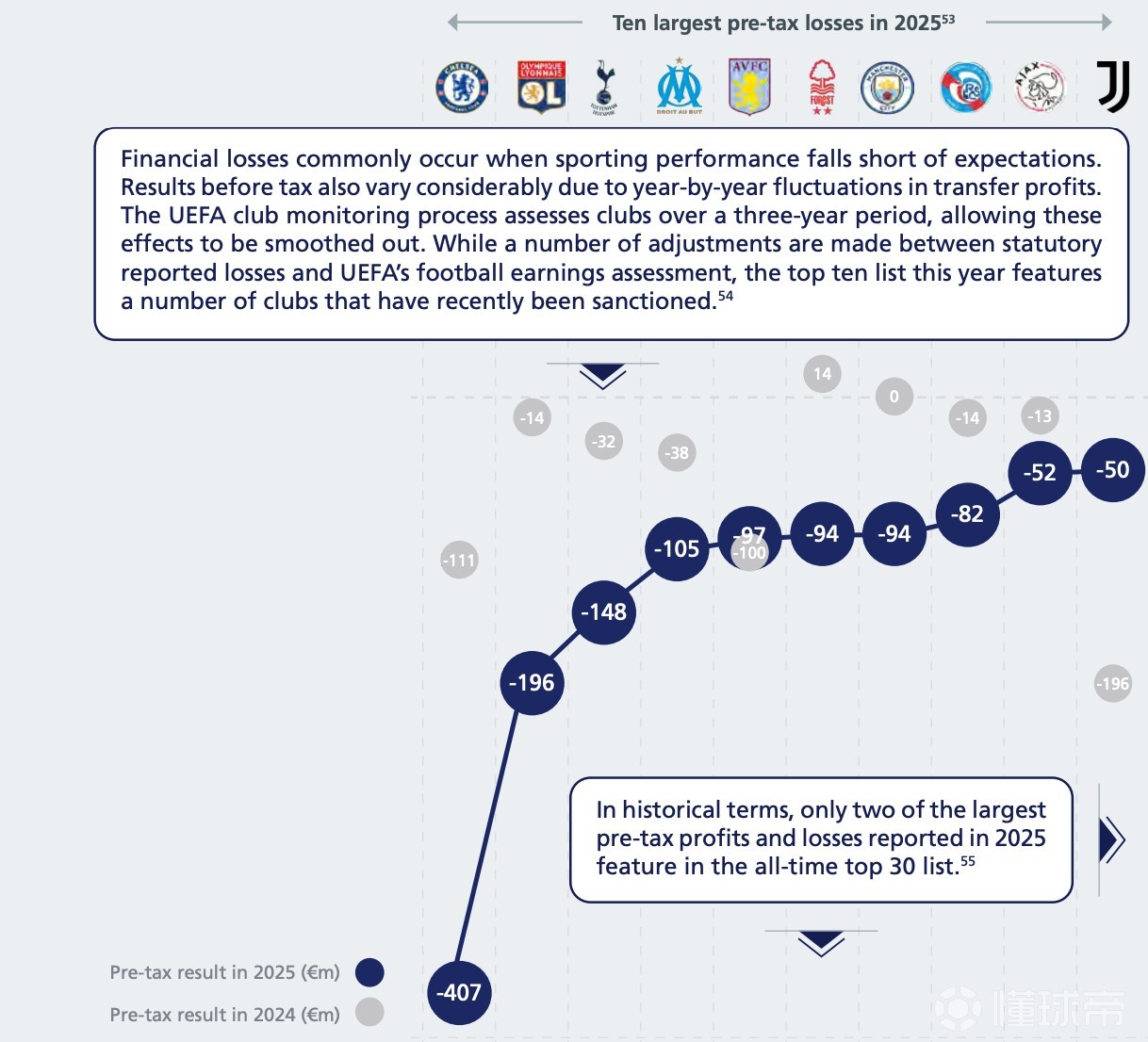 歐足聯(lián)統(tǒng)計(jì)2025年歐洲稅前虧損最高的10家俱樂(lè)部: