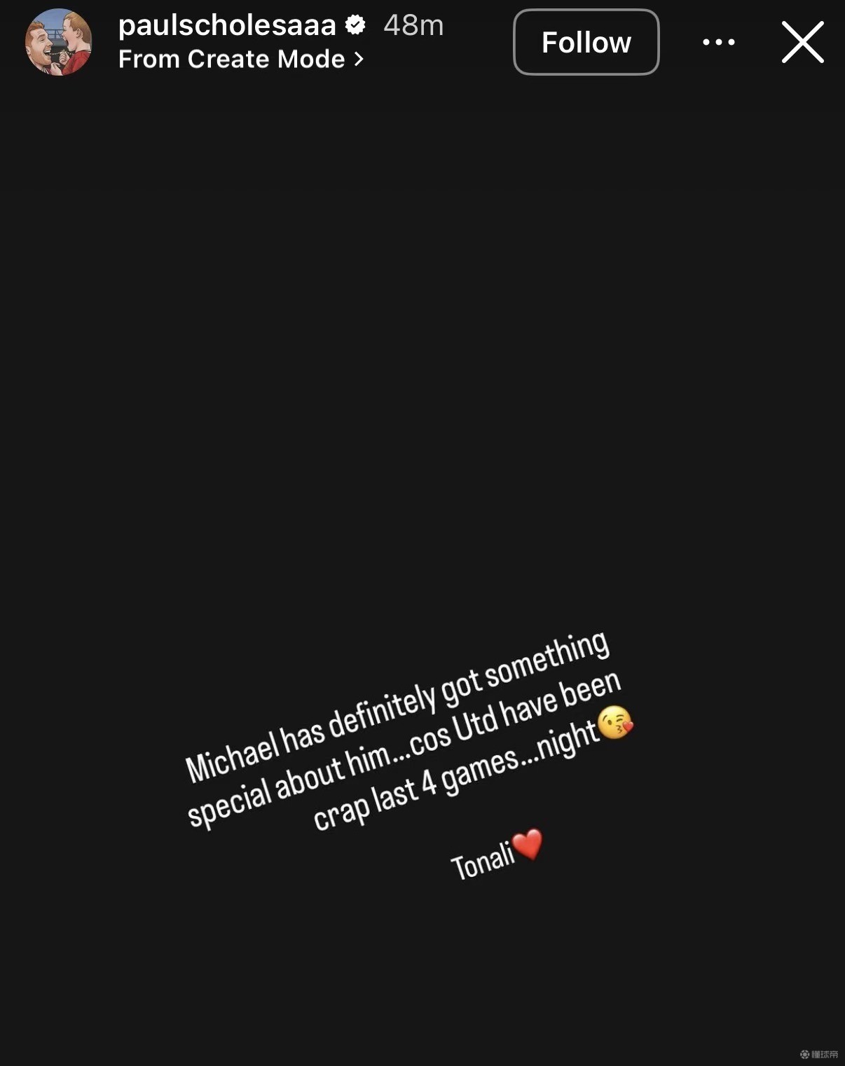 斯科爾斯在社交媒體發(fā)表動態(tài),寫道:“邁克爾(卡里克)身上肯定有某種特別之處,因為曼聯(lián)最近四場比賽踢得簡直爛透了……晚安