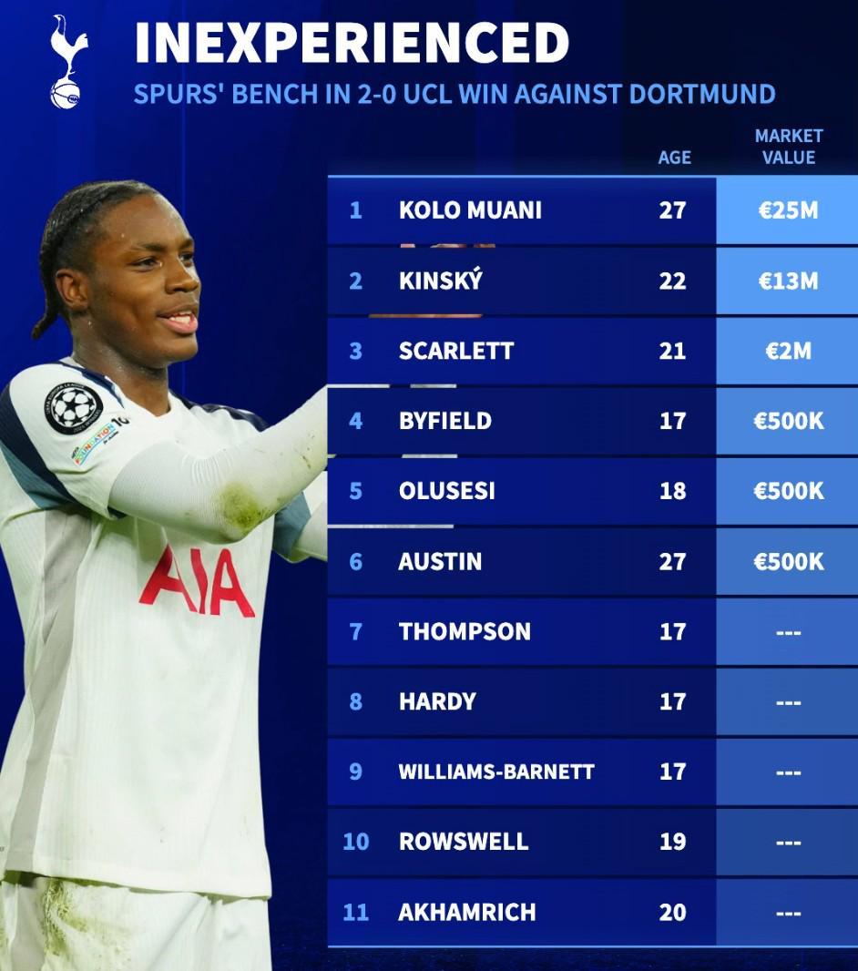 德轉的統(tǒng)計同時指出,在歐冠聯(lián)賽階段第7輪熱刺主場2-0擊敗多特蒙德的比賽中,熱刺替補席上的11名球員中有5人甚至在德轉上都沒有身價,剩余6人總身價也僅為4150萬歐元。