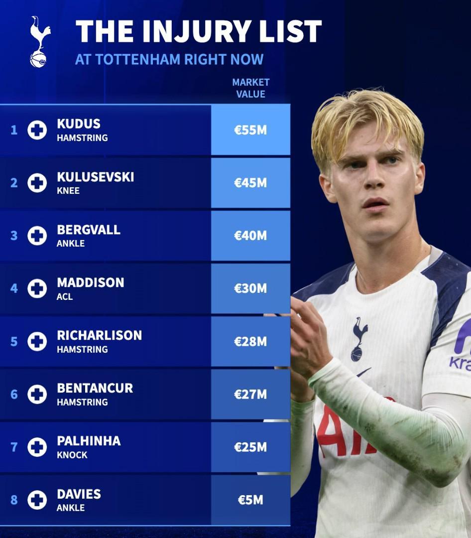 北京時間1月23日,在盧卡斯-貝里瓦爾腳踝受傷可能缺陣長達3個月之后,德轉列出了托特納姆熱刺目前的傷病名單,8名因傷高掛免戰(zhàn)牌的球員總身價達到了2.55億歐元。